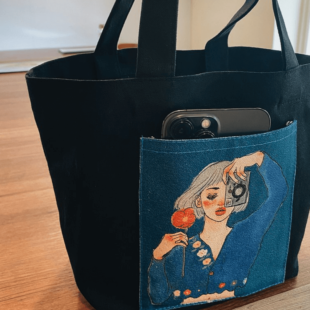 Beautiful canvas bag in calm deep blue colour, printed with lovely illustration of La Dolce Vita and rich details. We believe that you will bath in happiness when using this canvas bag, whether as your lunch bag or the ideal storage (large storage space!) for organising your notebooks, favourite stationery or any other items you wish to bring along with you. It has a front pocket at the front where you could store your small accessories and cellphone.