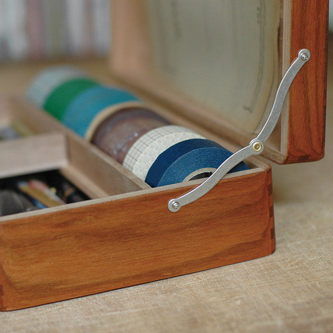 A beautifully crafted wooden toolbox, perfect for organising your rubber stamp collection, washi tapes, and various art supplies. This exquisitely designed toolbox features intricate details, including decorative hinges, a metal handle on the top, and a storage compartment in the lid.